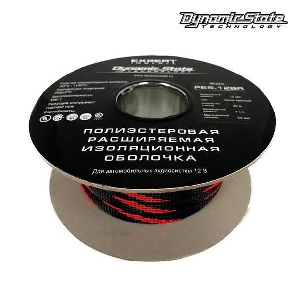 Dynamic State PES.12BR — полиэстеровая защитная оплетка («змейка») для силовых, акустических и RCA‑линий. Расширяемая конструкция позволяет надевать оплетку на жгуты, снижая риск перетирания и защищая проводку от вибраций; рабочий температурный диапазон заявлен от −50 до +150 °C.