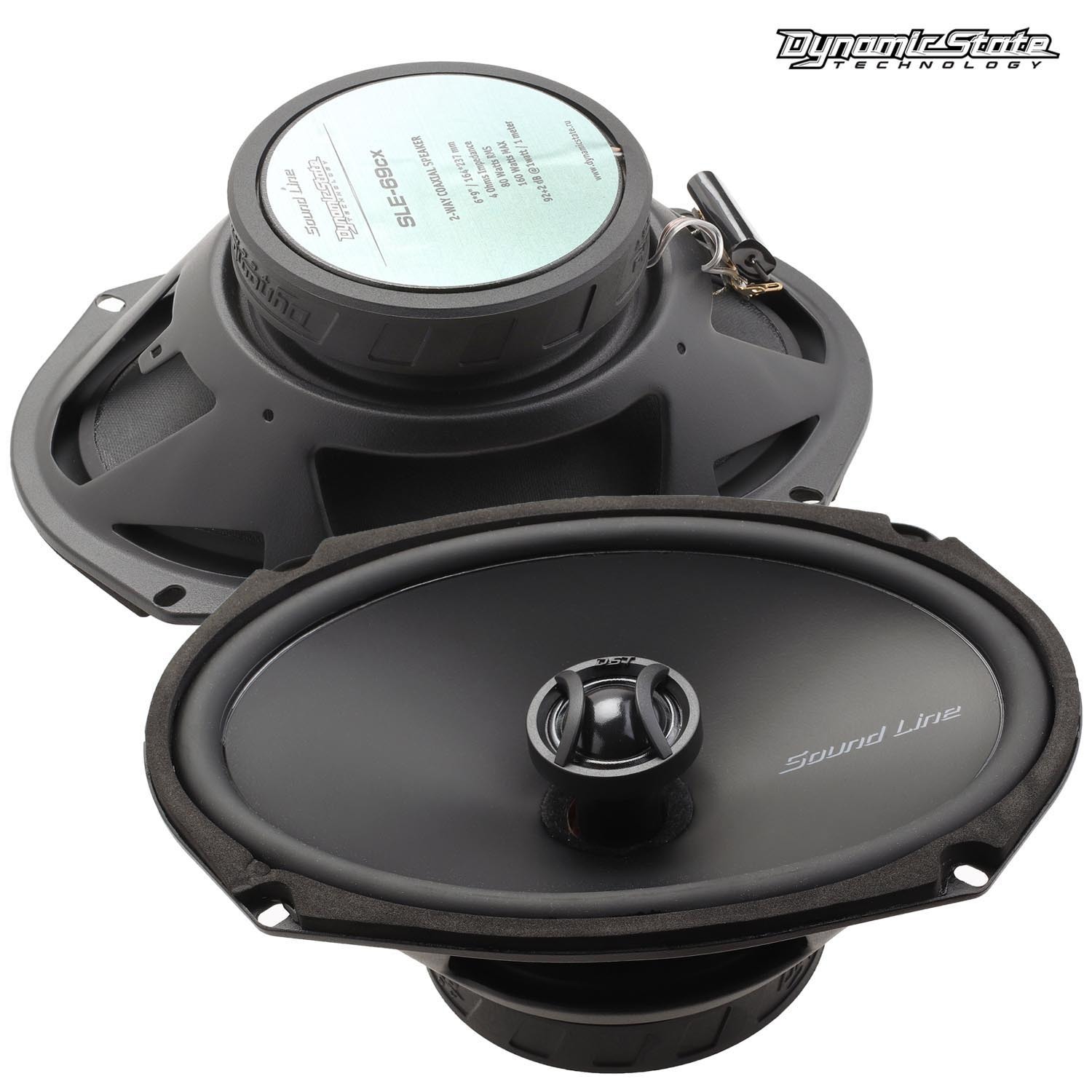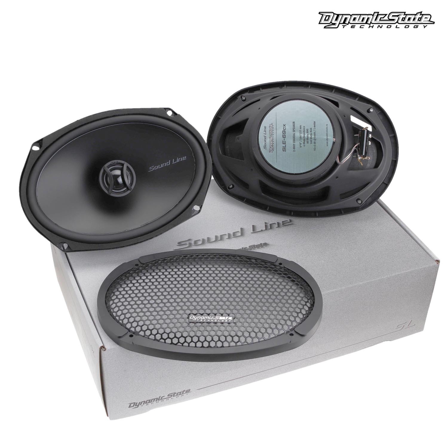 Dynamic State SLE-69cx — коаксиальные динамики серии SOUND LINE для установки в штатные места формата 6×9″. Номинальное сопротивление 4 Ω, мощность 80 Вт RMS (160 Вт MAX), чувствительность 92±2 dB, диапазон 55 Гц–20 кГц. Диффузор из целлюлозы, корзина стальная, магнит ферритовый. Монтажная глубина 75 мм. Защитные решетки — в комплекте.